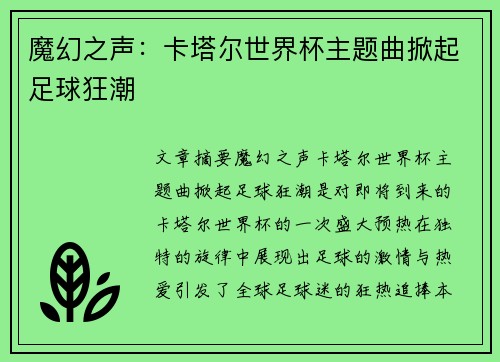 文章摘要:《魔幻之声:卡塔尔世界杯主题曲掀起足球狂潮》是对即将到来的卡塔尔世界杯的一次盛大预热,在独特的旋律中展现出足球的激情与热爱,引发了全球足球迷的狂热追捧。本文将从主题曲的意义、音乐特点、背后故事以及影响力等四个方面展开详细阐述。1、主题曲的意义从历届世界杯主题曲的角度分析卡塔尔主题曲的重要性...